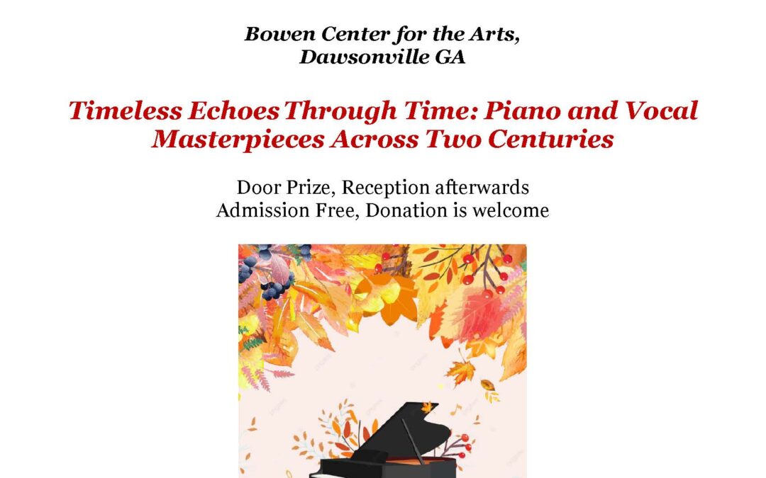 You will enjoy their selections “Timeless Echoes Through Time: Piano and Vocal Masterpieces Across Two Centuries.” Following the performance, enjoy door prizes and a reception to connect and share in the evening’s joy.